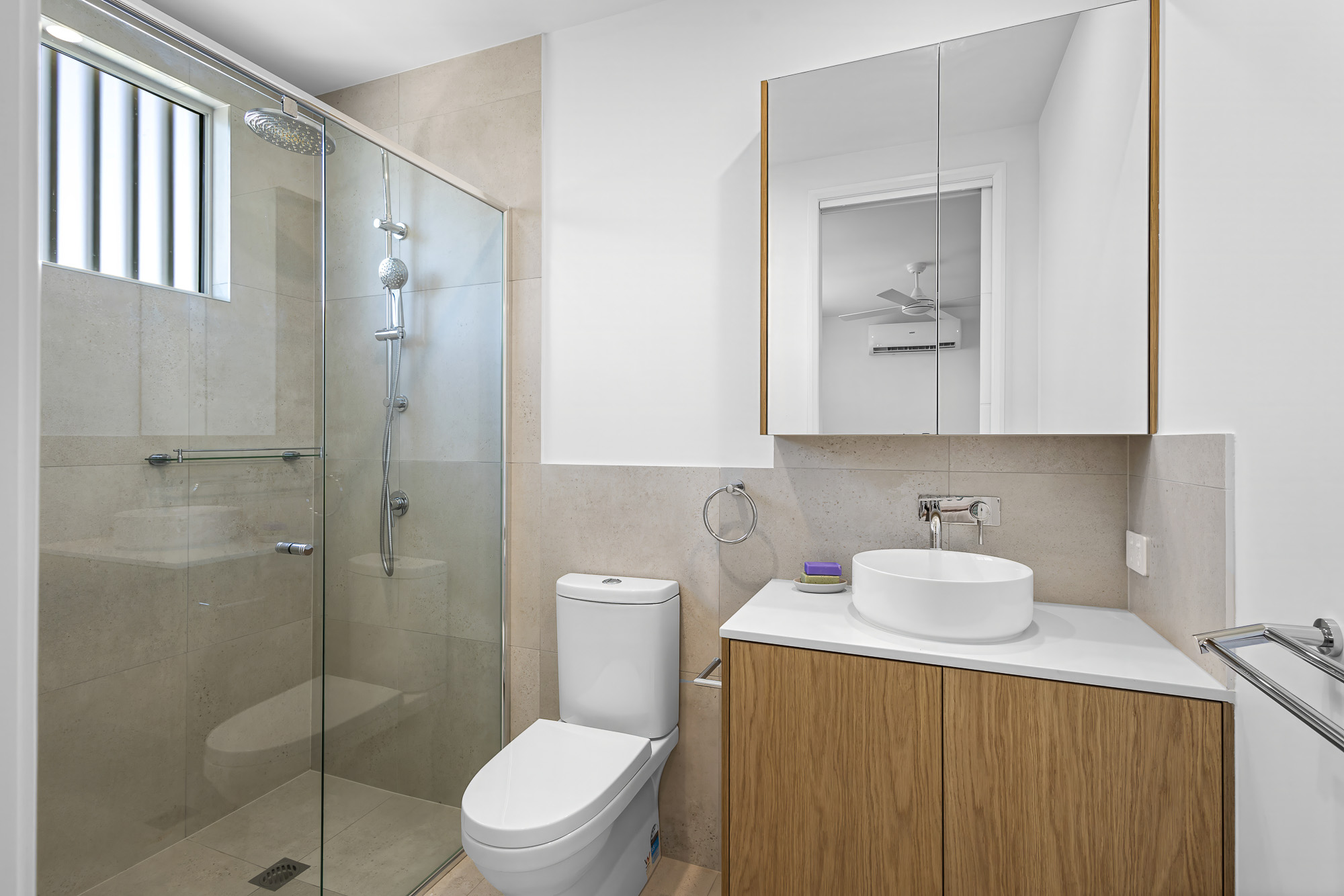 The seamless integration of indoor and outdoor spaces enhances the home's airy, open ambiance, with the private balcony serving as a natural extension of the living area. High ceilings further amplify the sense of space, while the kitchen's soft coastal palette-featuring natural timber, white stone benchtops and splashback-adds warmth and sophistication. It is well-equipped with an induction cooktop, premium appliances, and a plumbed fridge space. A conveniently located powder room on this level makes entertaining effortless.